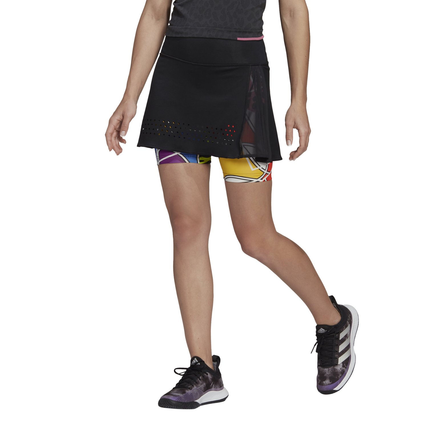 Laser-cut perforations and mesh on skirt allow the vibrant design on the shorts to peek through. AeroReady fabric ensures moisture control to make this a winner on the court and beyond.