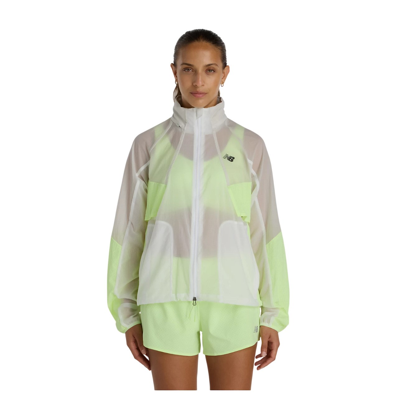 Packable hood with lightweight, secure zipper Long sleeves with elasticated cuffs for comfortable fit Zippered hand pockets for secure storage Packable design with hand elastic for easy carrying Durable water-repellent (DWR) coating for light rain resistance Flying NB logo at left chest